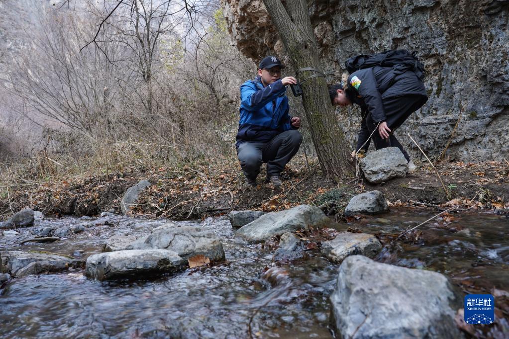 保護區工作人員在小溪邊布設紅外相機(11月9日攝)。