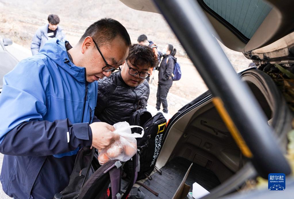 趙明騰(前)在進(jìn)山前將一袋作為午餐的煮雞蛋裝入背包中(11月9日攝)。
