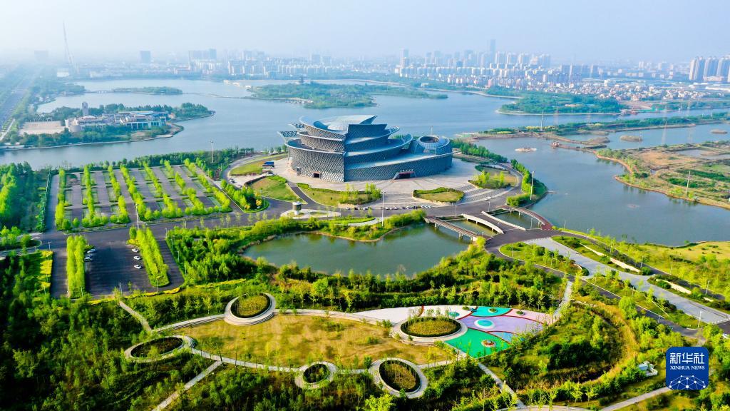 東營(yíng)市清風(fēng)湖景色(2021年5月12日攝,無(wú)人機照片)。