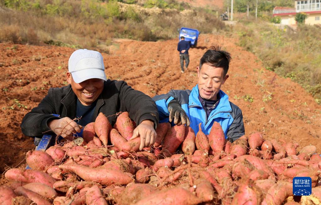 11月14日,河南省洛陽(yáng)市汝陽(yáng)縣劉店鎮二郎村農民在薯田收獲紅薯。