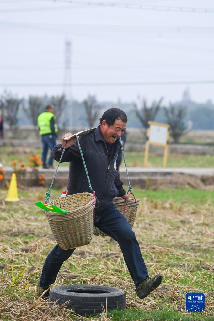 11月15日,參賽村民參加“扁擔挑糧”趣味比賽。