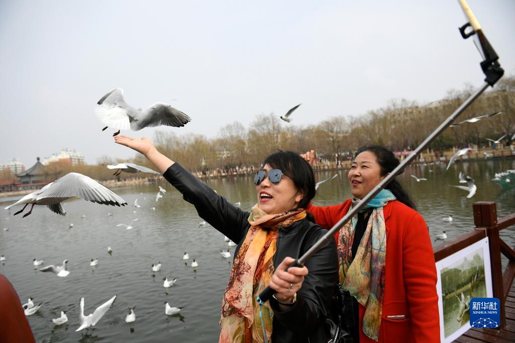 市民在寧夏銀川市燕鴿湖觀(guān)賞、喂食紅嘴鷗(2017年3月20日攝)。