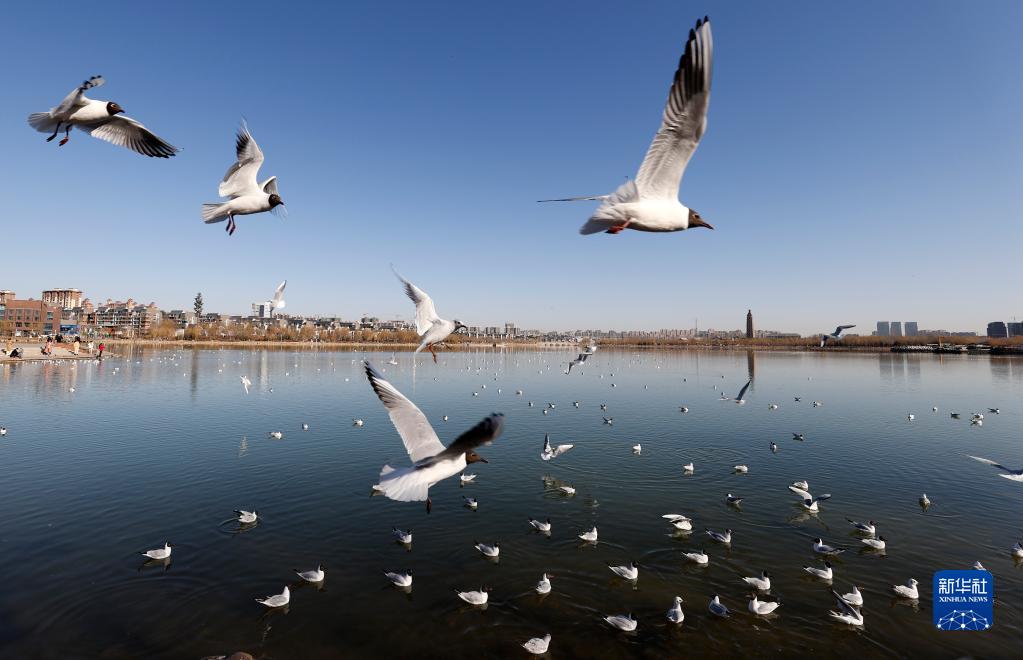 寧夏銀川市海寶公園飛翔的紅嘴鷗(2020年3月14日攝)。