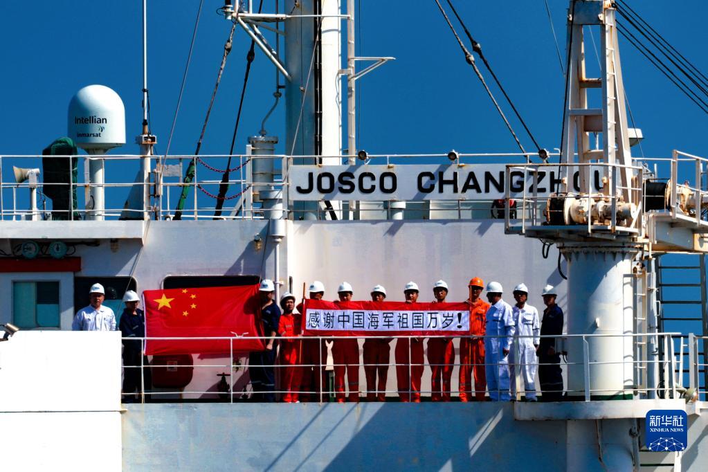 被護船舶向中國海軍第41批護航編隊展示國旗和寫(xiě)有“感謝中國海軍祖國萬(wàn)歲”字樣的橫幅(8月5日攝)。