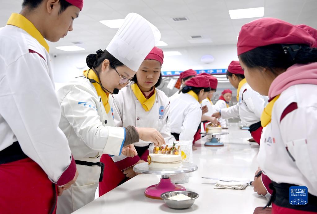 藍田廚師學(xué)校的學(xué)生在教師指導下學(xué)習蛋糕制作(11月15日攝)。
