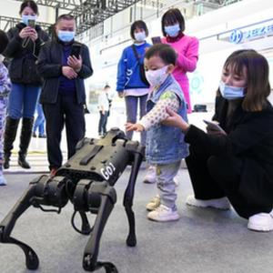 11月16日,在第十屆中國(綿陽(yáng))科技城國際科技博覽會(huì )上,小朋友與仿生智能四足機器狗互動(dòng)。
