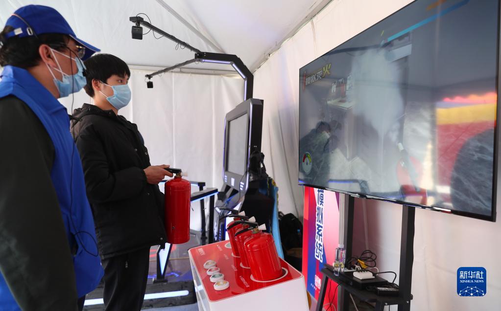 11月15日,在虹口區消防救援支隊舉行的宣傳活動(dòng)中,社區居民體驗根據不同火情選擇正確滅火器撲救的模擬游戲。