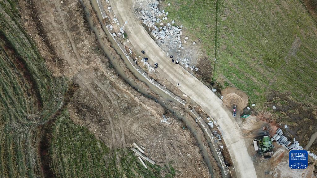 11月17日,在湘潭市湘鄉市梅橋鎮梅橋村,工人進(jìn)行水渠改造作業(yè)(無(wú)人機照片)。