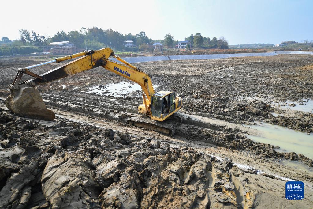 11月17日,在湘潭市湘鄉市泉塘鎮雙江村,工人使用機械修建蓄水塘。