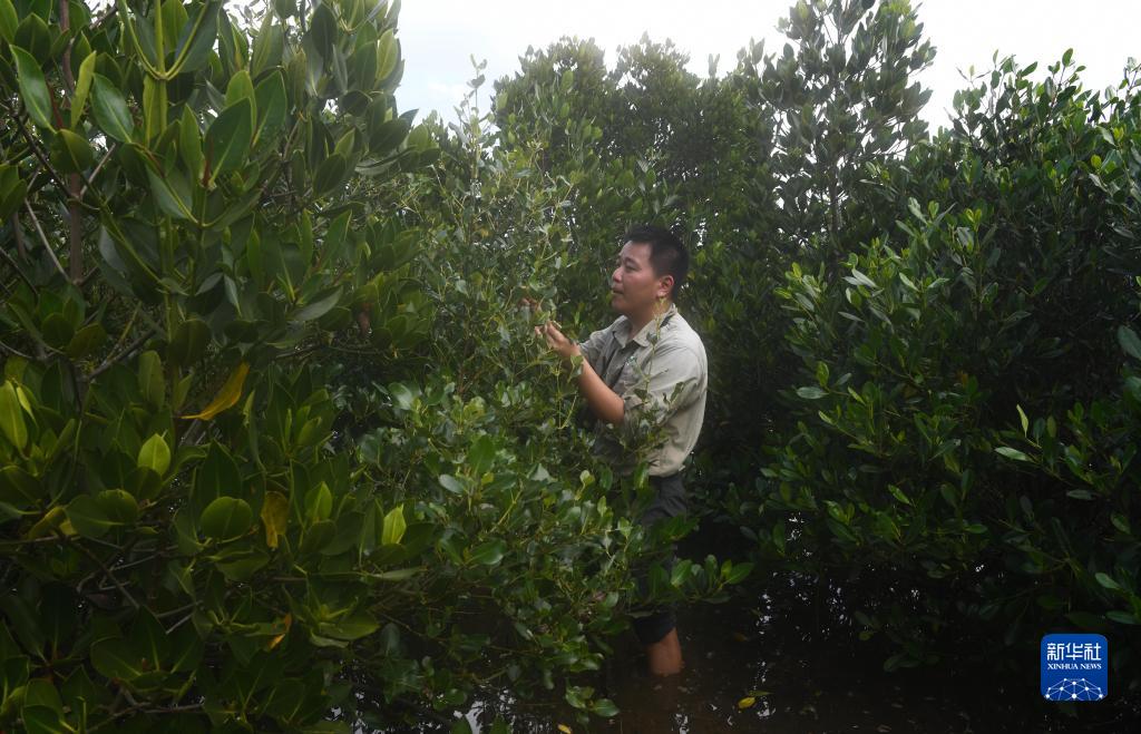 海南東寨港國家級自然保護區林業(yè)工程師馮爾輝在保護區內的灘涂上查看紅樹(shù)林(2019年12月18日攝)。