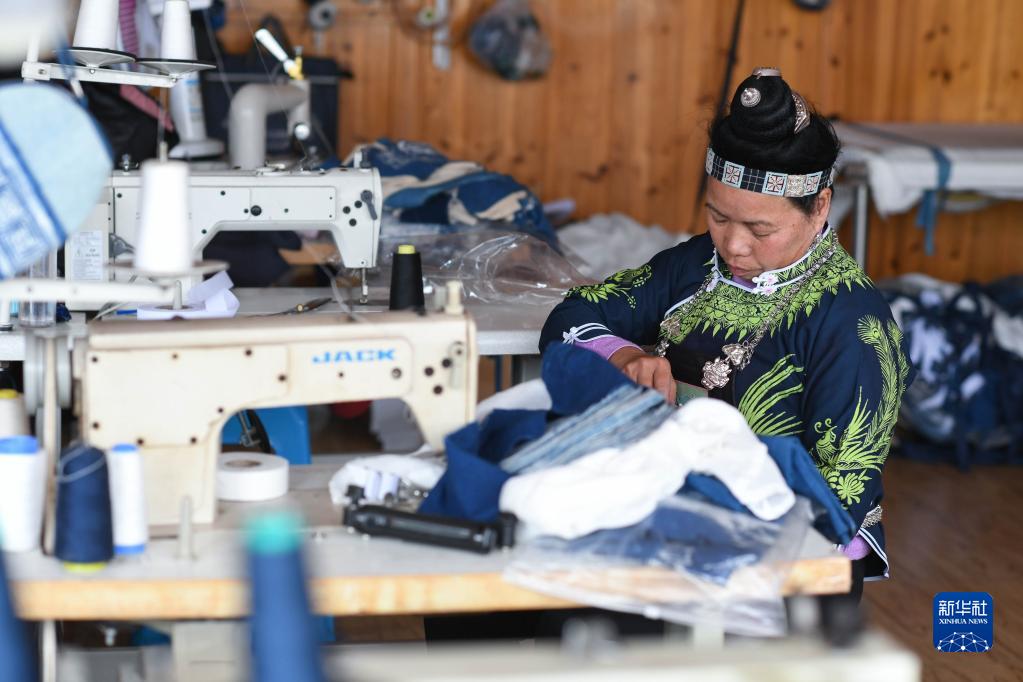 在貴州省丹寨縣龍泉鎮卡拉村的苗族蠟染工坊,村民在趕制蠟染文創(chuàng )訂單產(chǎn)品(11月16日攝)。