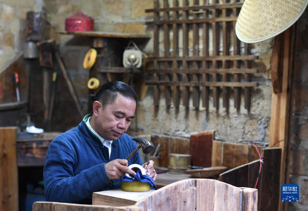 在貴州省丹寨縣龍泉鎮卡拉村的銀飾鍛造工坊,苗族手工藝人在制作銀制器具(11月16日攝)。