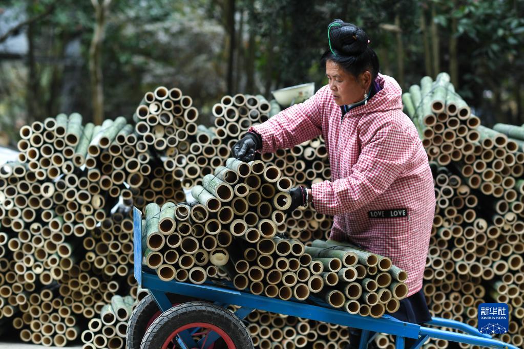 11月17日,在貴州省丹寨縣龍泉鎮卡拉村,村民在搬運用于制作竹編鳥(niǎo)籠的竹子。