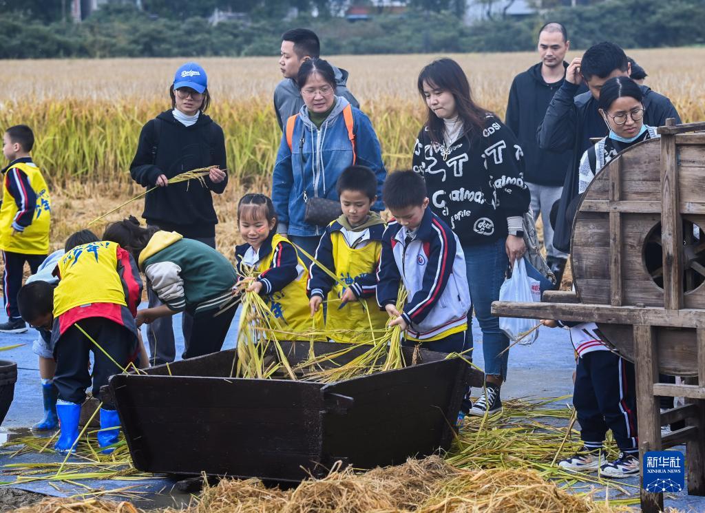 11月19日,孩子們在家長(cháng)的帶領(lǐng)下體驗傳統打稻谷。