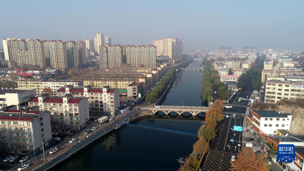 這是11月19日在河北省石家莊市井陘縣拍攝的金良河沿岸景色(無(wú)人機照片)。