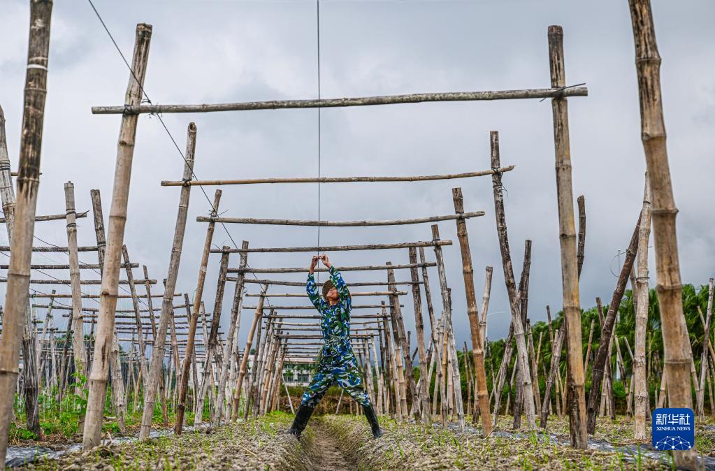 11月20日,在屯昌縣楓木鎮,農民為種植楓木苦瓜搭建瓜棚。