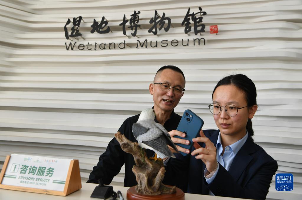 在閩江河口濕地公園濕地博物館里,張潮巨(左)和博物館講解員劉文婧一起進(jìn)行直播,向網(wǎng)友宣傳鳥(niǎo)類(lèi)保護知識(11月19日攝)。