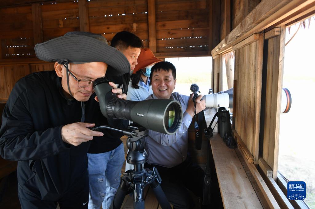 張潮巨(左一)和同事在閩江河口濕地核心區域觀(guān)鳥(niǎo)屋里,觀(guān)測停留在濕地里的候鳥(niǎo)種類(lèi)(11月19日攝)。