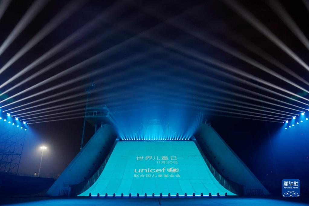 11月20日,北京首鋼滑雪大跳臺為世界兒童日亮燈。