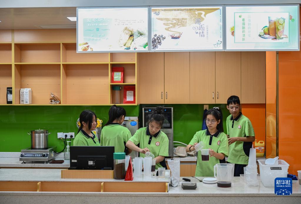 11月20日,聽(tīng)障學(xué)生在泉州市特殊教育學(xué)校的水吧教室里上奶茶制作課。