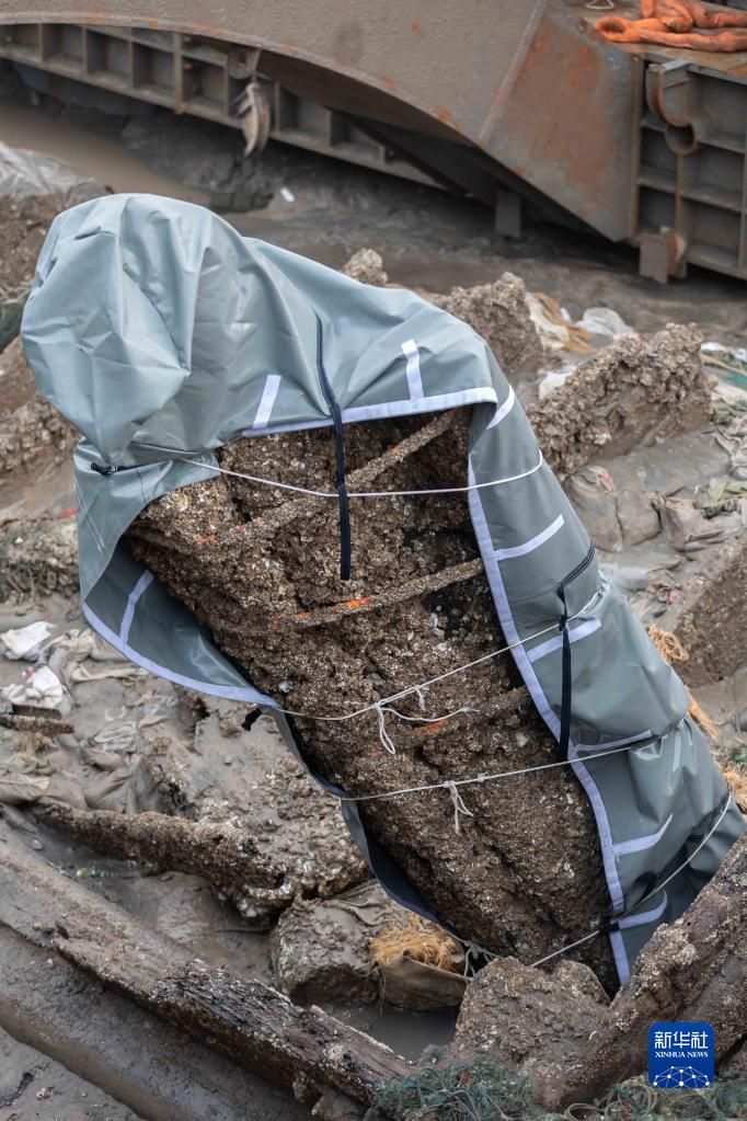 11月21日清晨,工作人員對露出水面的長(cháng)江口二號古船桅桿做好保護措施。