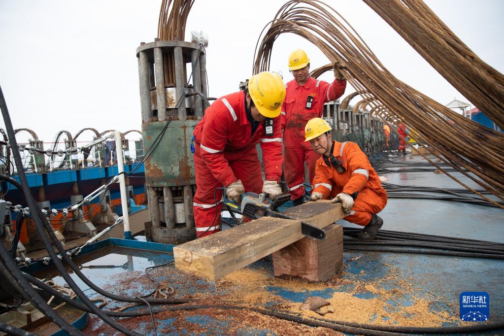 11月21日清晨,工作人員準備綁扎固定古船船體的物件。