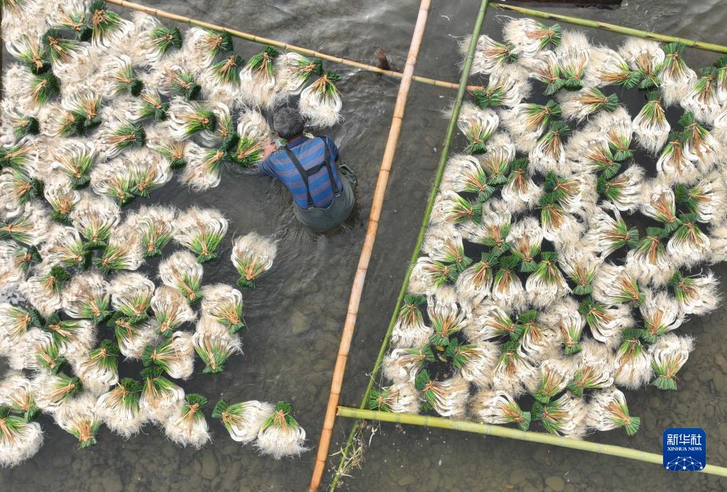 11月21日,在湖南省永州市道縣營(yíng)江街道車(chē)邊社區,農民在清洗藠頭(無(wú)人機照片)。