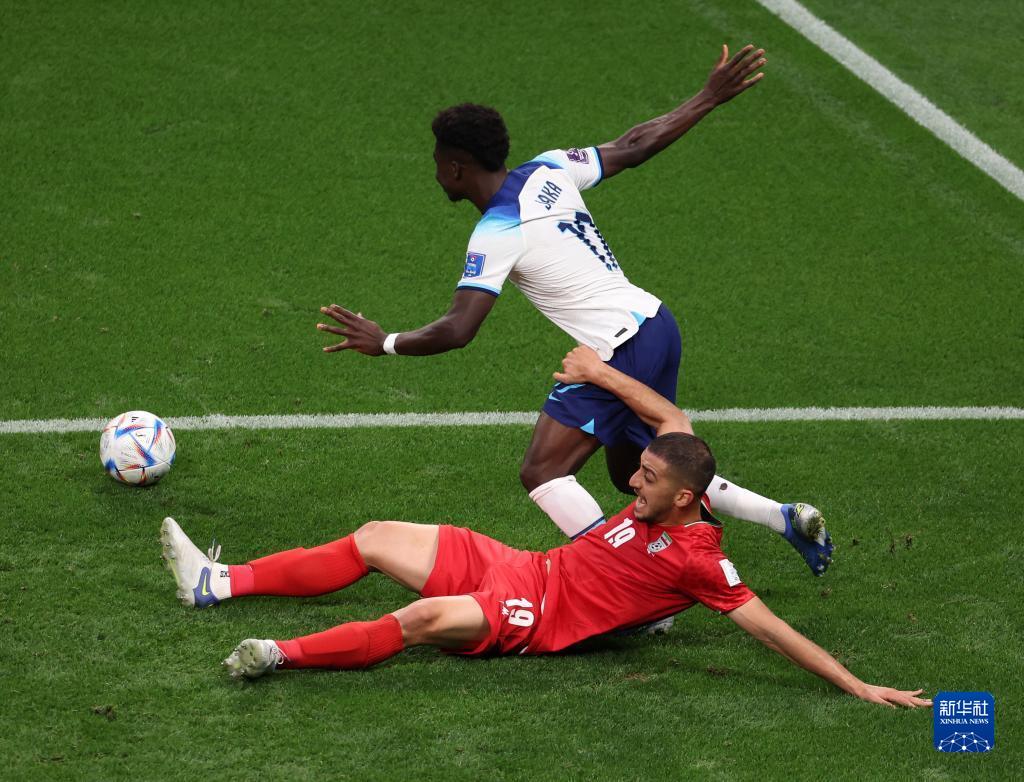 11月21日,英格蘭隊球員薩卡(上)與伊朗隊球員馬吉德·侯賽尼拼搶。