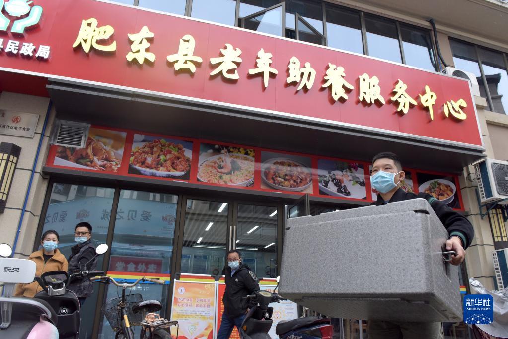 11月22日,在安徽省合肥市肥東縣老年助餐服務(wù)中心前,肥東縣老年助餐服務(wù)中心經(jīng)理李杰(右一)將打包好的午餐往周邊老人家中配送。