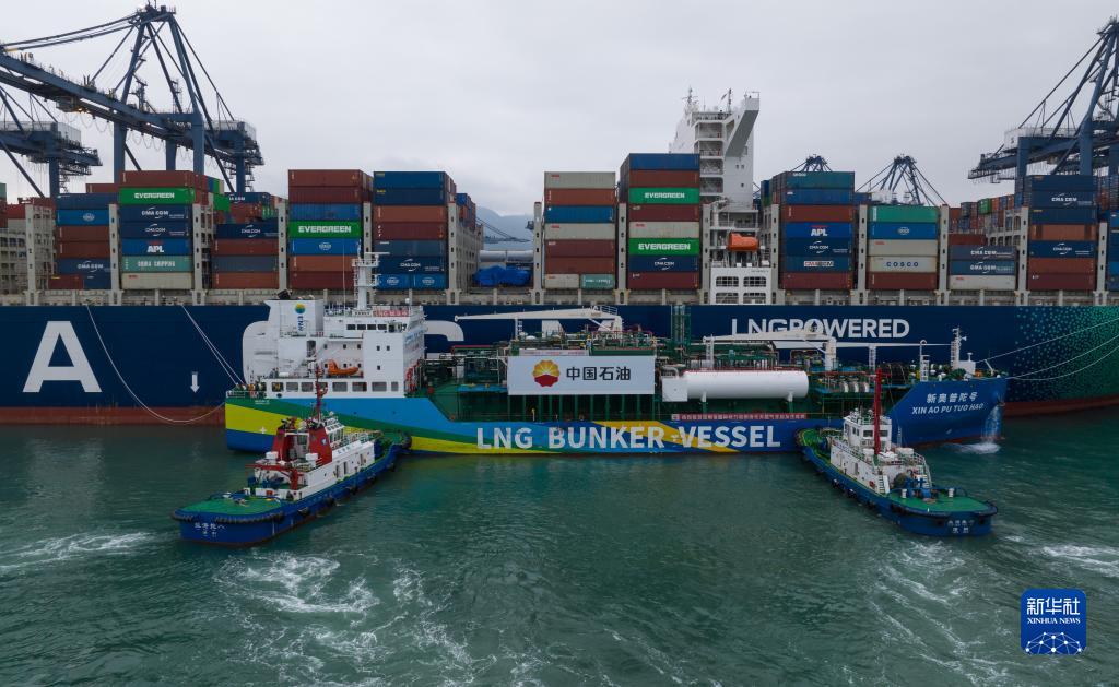 11月22日,在深圳鹽田港,C型罐式LNG加注船“新奧普陀號”與法國達飛集團的雙燃料集裝箱船“達飛·索邦”號對接(無(wú)人機照片)。