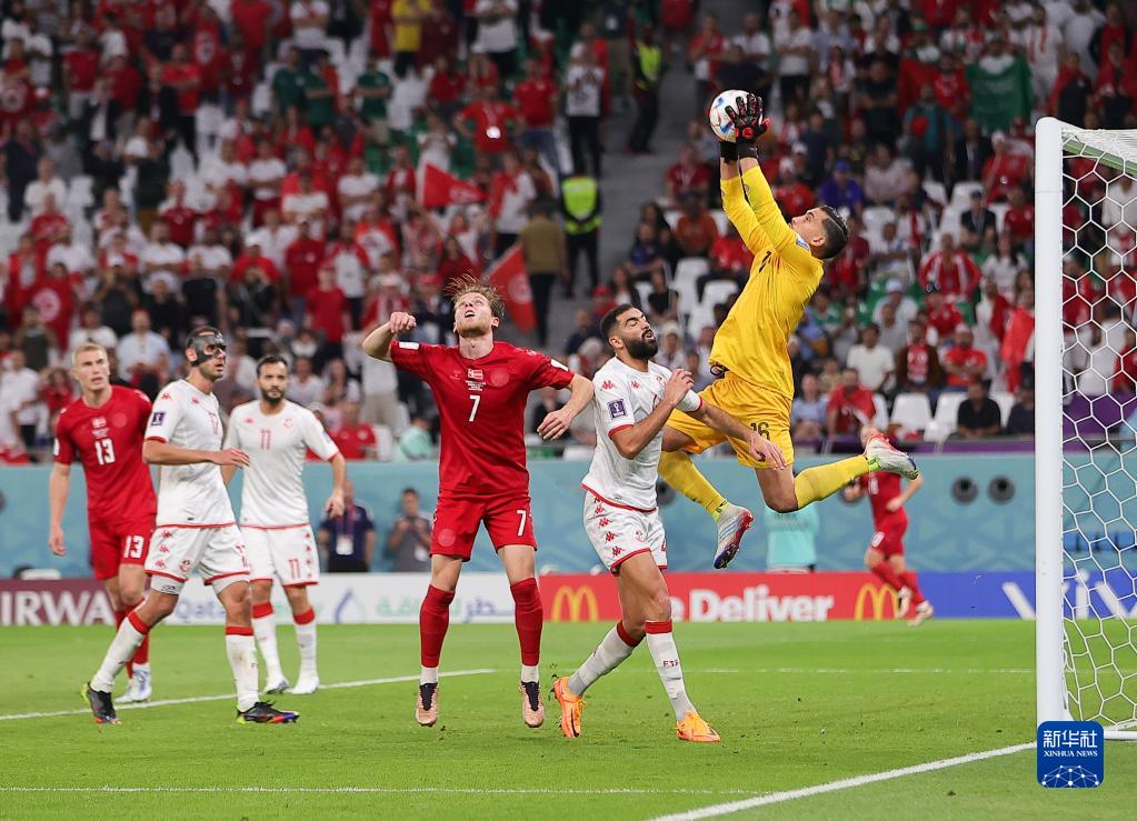 當日,在卡塔爾賴(lài)揚教育城球場(chǎng)進(jìn)行的2022卡塔爾世界杯足球賽D組比賽中,丹麥隊以0比0戰平突尼斯隊。