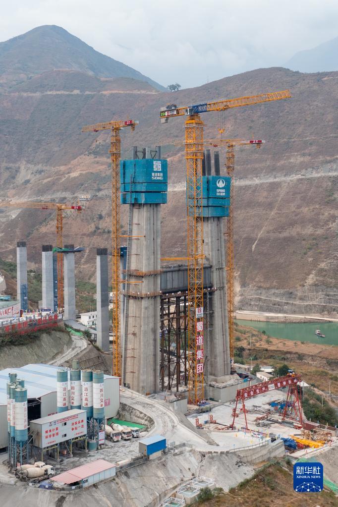 這是11月23日拍攝的卡哈洛金沙江大橋施工現場(chǎng)(無(wú)人機照片)。