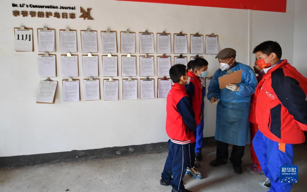 江西省九江市都昌縣鄱陽(yáng)湖馬影湖區“候鳥(niǎo)醫院”的負責人李春如向學(xué)生講述護鳥(niǎo)故事(11月23日攝)。