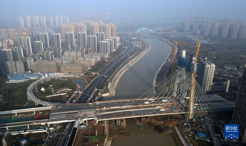 這是正在進(jìn)行主塔封頂施工的引江濟淮金寨南路橋(11月24日攝,無(wú)人機照片)。