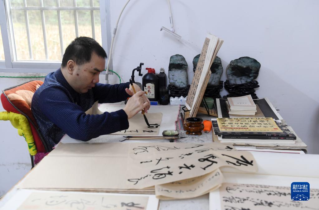 11月24日,在都安瑤族自治縣大興鎮九頓村那內屯家里,王金寶在練習書(shū)法。
