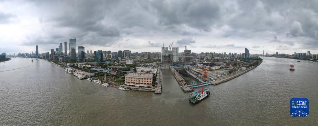 上海船廠(chǎng)舊址1號船塢已打開(kāi)閘門(mén),完成灌水,靜候長(cháng)江口二號古船(無(wú)人機照片,11月23日攝)。
