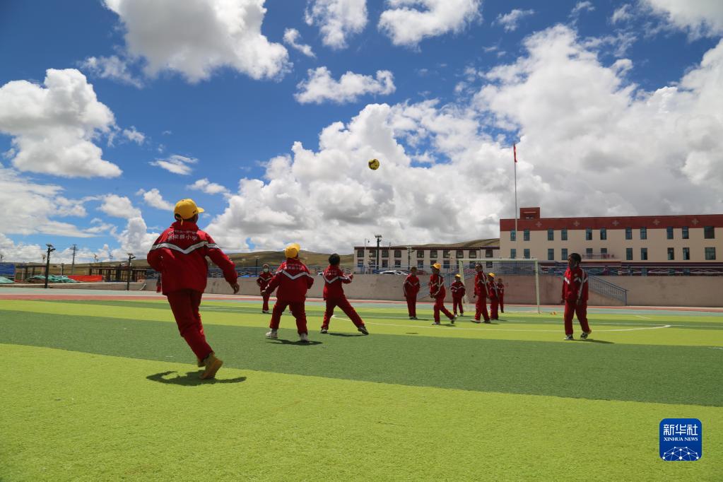 西藏那曲市聶榮縣小學(xué)的學(xué)生們在踢足球(4月20日攝)。