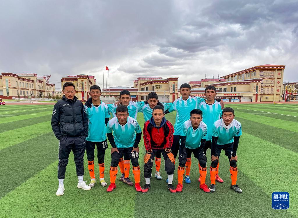 在獲得西藏那曲市第五屆U15校園足球聯(lián)賽冠軍后,嘉黎縣中學(xué)的孩子們和足球老師向巴宗卓(左一)在操場(chǎng)上合影留念(4月30日攝)。