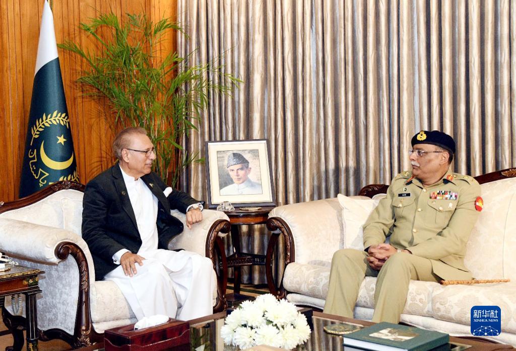 11月24日,巴基斯坦總統阿爾維(左)在首都伊斯蘭堡會(huì )見(jiàn)候任參謀長(cháng)聯(lián)席會(huì )議主席薩希爾·沙姆沙德·米爾扎。