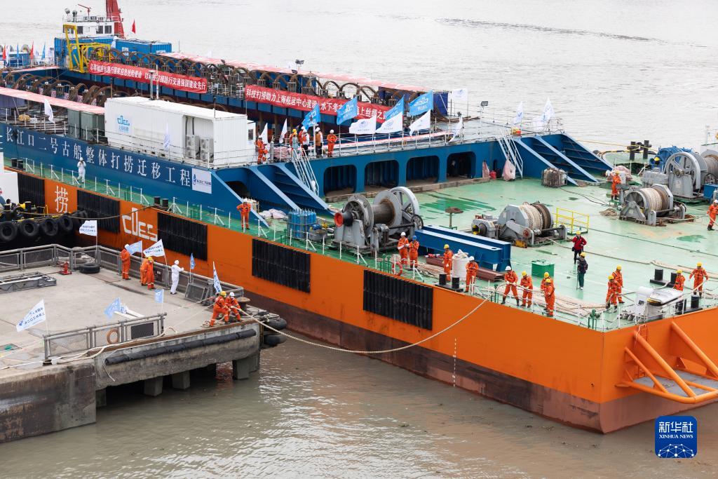 11月25日,“奮力”輪載著(zhù)長(cháng)江口二號古船??可虾4瑥S(chǎng)舊址1號船塢,準備進(jìn)塢。