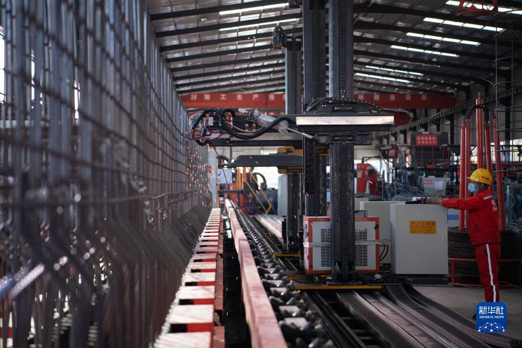 11月25日,在“智慧梁廠(chǎng)”生產(chǎn)線(xiàn)上,工作人員操作機器人焊接。