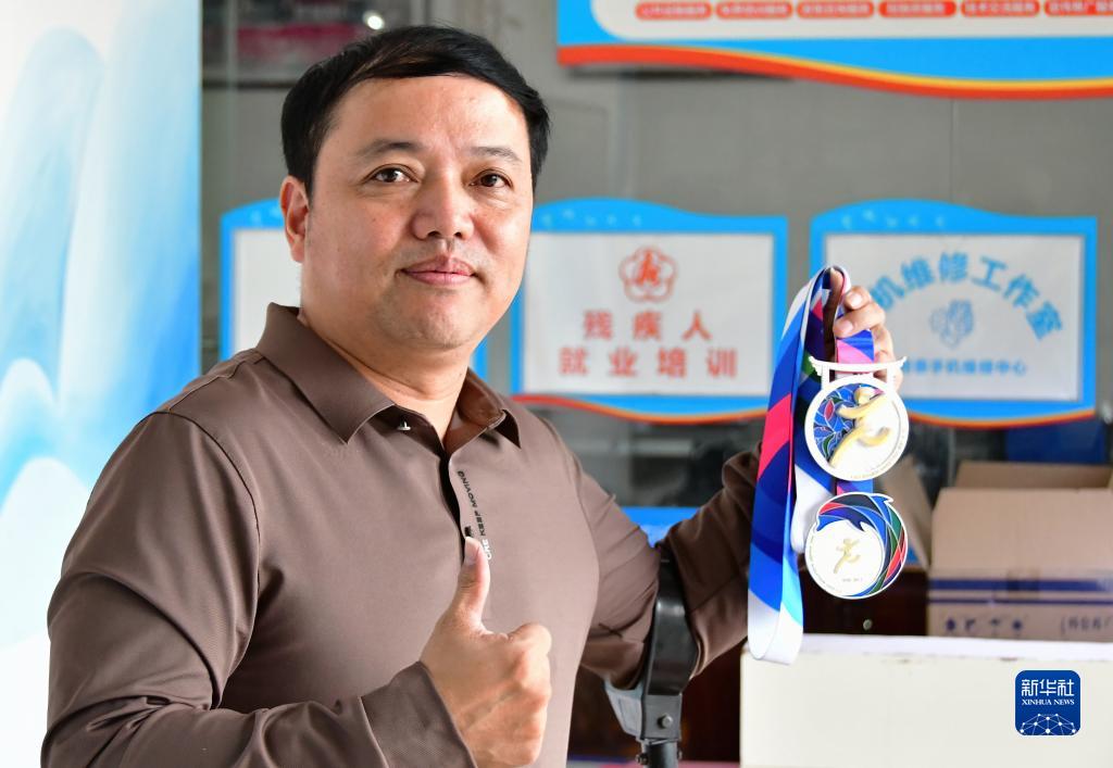謝啟明在展示自己參加兩屆廈門(mén)馬拉松比賽的獎牌(11月25日攝)。新華社記者 魏培全 攝