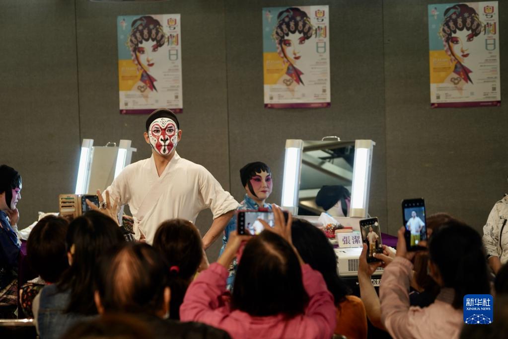11月27日,粵劇演員向觀(guān)眾示范粵劇化妝。新華社發(fā) (香港特區政府新聞處供圖)