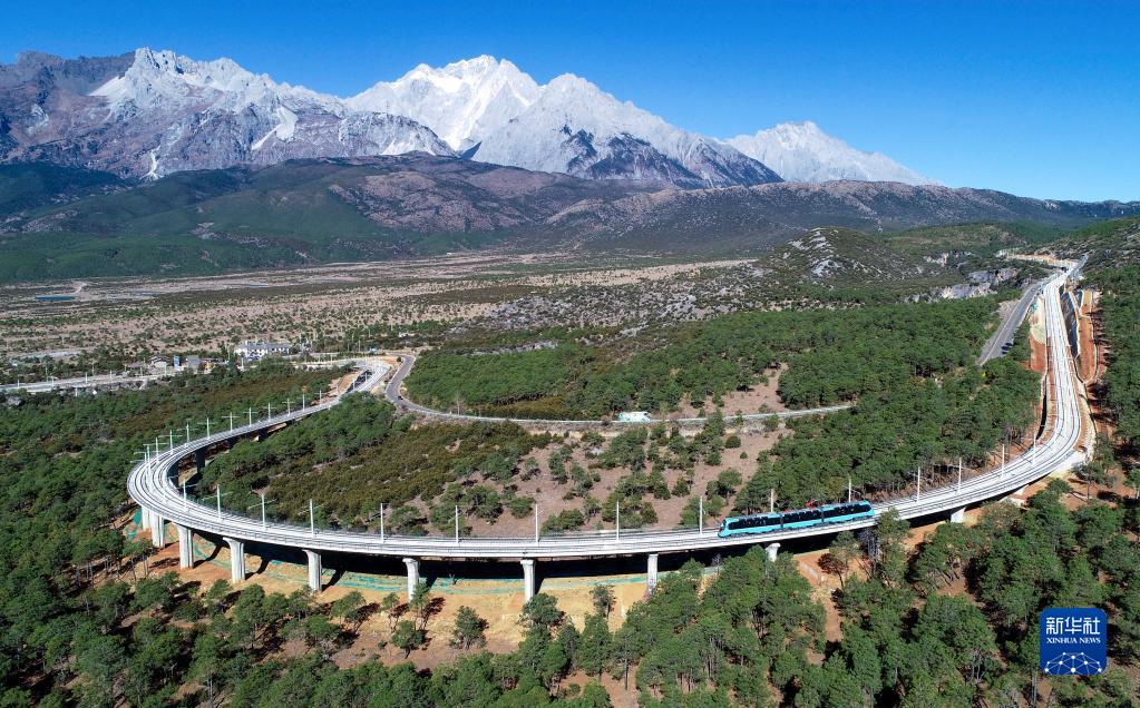 11月28日,觀(guān)光火車(chē)行駛在麗江觀(guān)光火車(chē)一期工程鐵路線(xiàn)東巴谷1號大橋,遠處是玉龍雪山(無(wú)人機照片)。