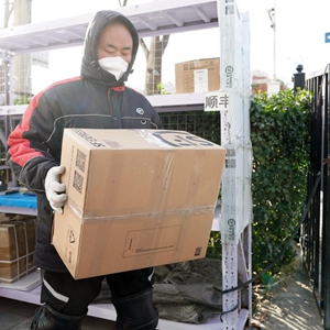 11月29日,在北京市海淀區中關(guān)村街道一處快遞點(diǎn),快遞員在寒風(fēng)中搬運快遞。