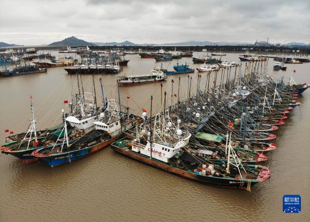 11月29日,在浙江省臺州市路橋區金清鎮漁港,漁船進(jìn)港避風(fēng)(無(wú)人機照片)。