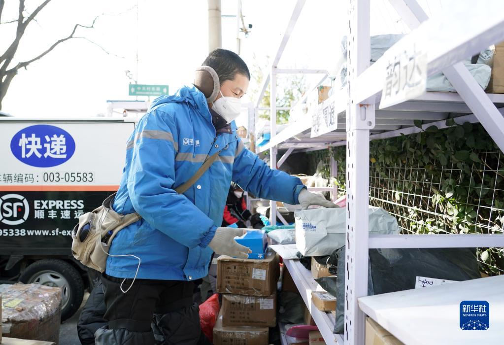 11月29日,在北京市海淀區中關(guān)村街道一處快遞點(diǎn),快遞員在寒風(fēng)中整理快遞。