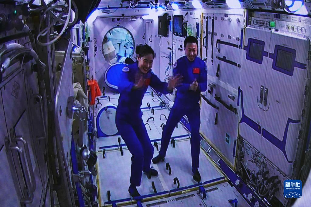 11月30日在酒泉衛星發(fā)射中心拍攝的神舟十四號航天員劉洋、蔡旭哲在問(wèn)天實(shí)驗艙迎接神舟十五號航天員乘組的畫(huà)面。