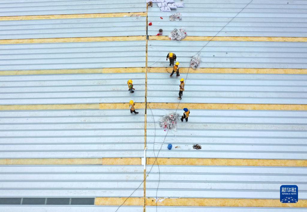 工人在中新南寧國際物流園的電商物流園進(jìn)行頂棚施工(11月29日攝,無(wú)人機照片)。