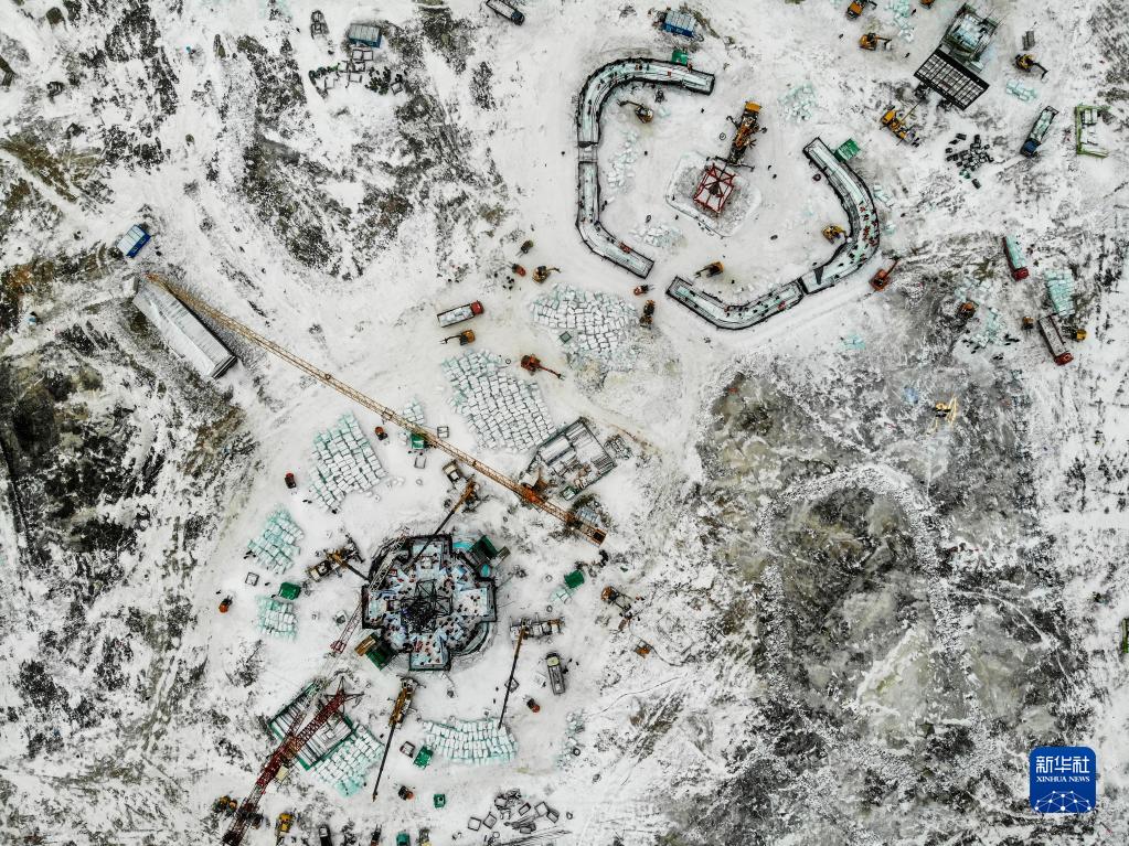 這是11月29日拍攝的哈爾濱冰雪大世界園區冰建項目施工現場(chǎng)(無(wú)人機照片)。